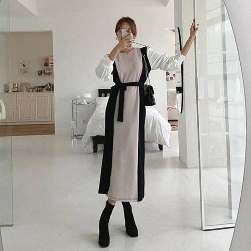 [에이치플러스몰]쉬폰 원피스 셔츠 여름 니트 벨트 폴라넥 롱니