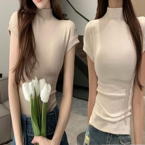 밀크린 여성 부드러운 반팔 반목티 목폴라티 2종 세트 폴라티 5부 티셔츠