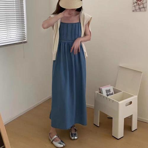 [옷자락] [시즌오프]여름 캐주얼 핀턱 셔링 민소매 청 데님 롱원피스_5