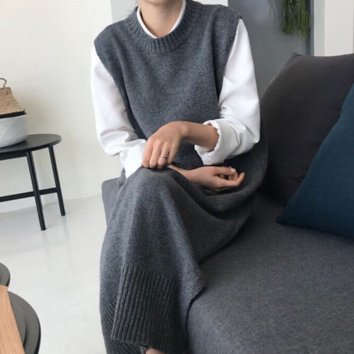[피커]발목 롱 라운드 니트 조끼 라운드조끼 원피스 차콜