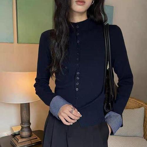 TKX 여성용 캐주얼 긴팔 배색 카라 니트 블라우스 봄 가을 패션 클래식 귀여운 니트 KN53