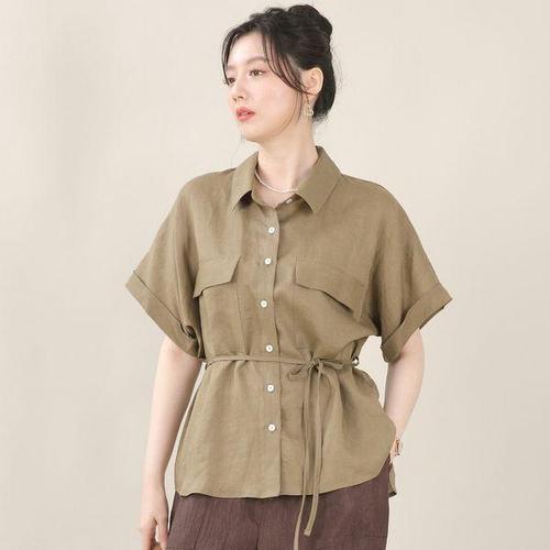 [애비뉴투지]엄마옷 린넨 셔츠 카라 플랩 포켓 주머니 단추 허리끈 여성 여름 반팔 남방 블라우스 B06530