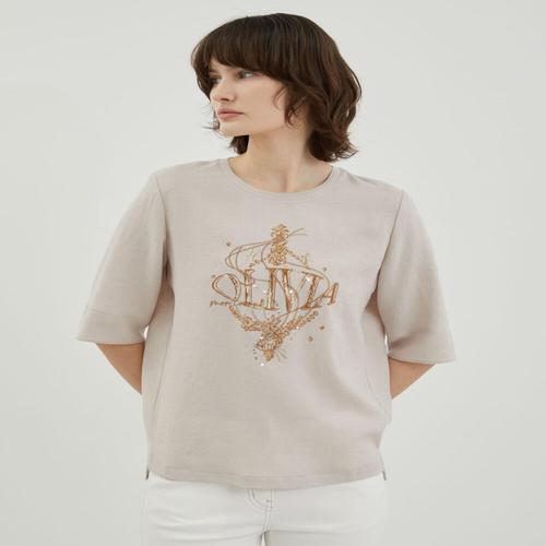 올리비아로렌 HC04 브이넥 린넨 자수 티셔츠 VOBAS5M3251