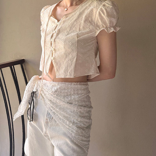 펀칭 반팔 롱 셔츠 블라우스 ST24051901
