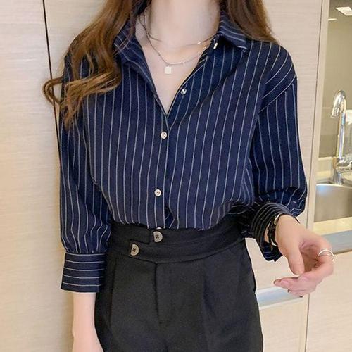 깔끔세련 쿨터치 블라우스세로줄셔츠 직장인 여성 단추 스트라이프 데일리 세련된 카라 여자 남방