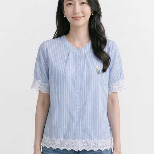 NB3146 산뜻 스트라이프 플라워 자수 레이스 반팔 블라우스 셔츠