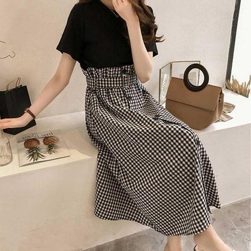 [엄지척]여자 여름 데이트 룩 체크 롱 스커트 반팔 티 세트_19956628_667501