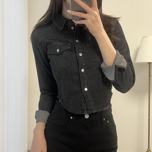 [옷자락]여자 청남방 Y2K 워싱 크롭 투포켓 간절기 스판 셔츠