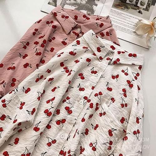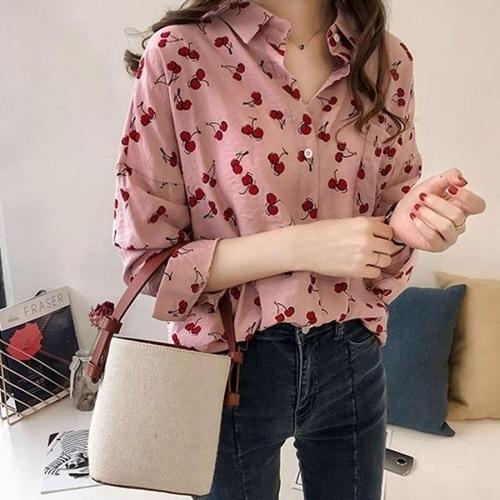 [엄지척]예쁜 체리패턴 가슴 포켓 블라우스 캐주얼 여자 셔츠_19644742_667501
