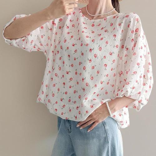 [다잇템]여성 체리무늬 핀턱 귀여운 시폰 블라우스
