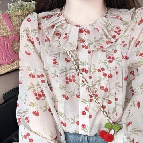 [다잇템]여성 핀턱 체리무늬 시폰 귀여운 블라우스