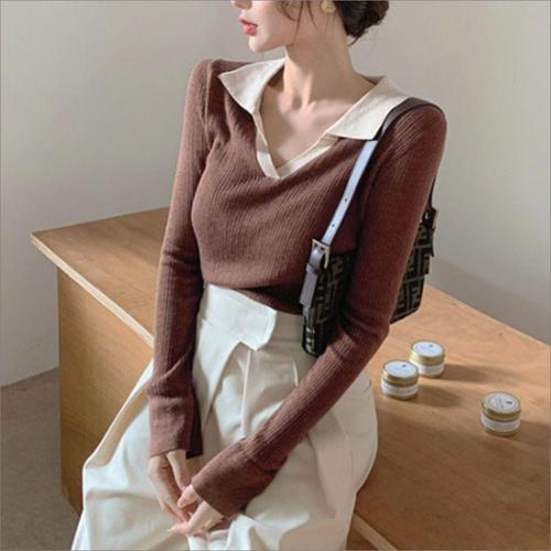 여성 카라 골지 v넥 니트 긴팔 카라티 상의 여리여리 2색 WFKXMF4
