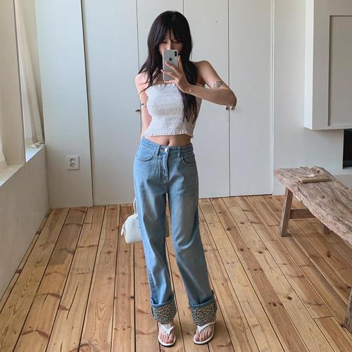 [신상오픈런]여성 중청 색상 롤업 레오파드 와이드핏 스판 청바지