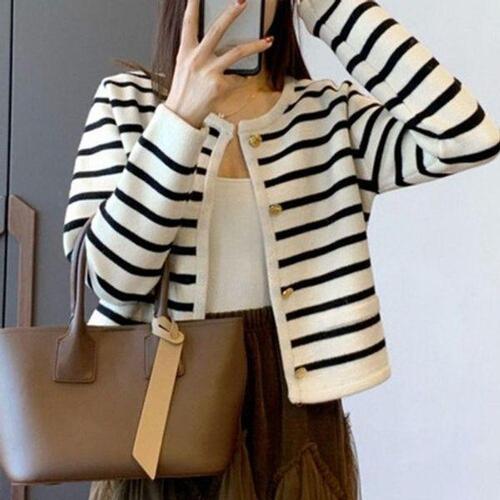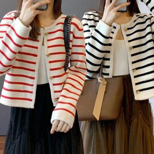 [끌레아]여성 단가라 스트라이프 금장 단추 니트 가디건 여자 봄가디건 카디건 라운드 여성봄