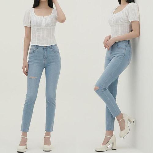 여성 세미 슬림핏 컷팅 찢어진 청바지 연청 로우핏