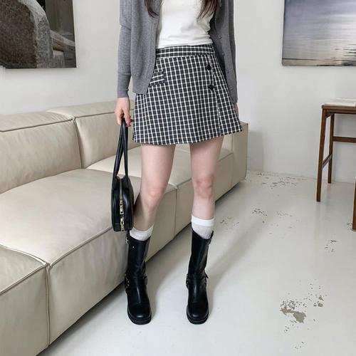 [다잇템]여자 키치무드 치마 랩 투버튼 격자 치마바지