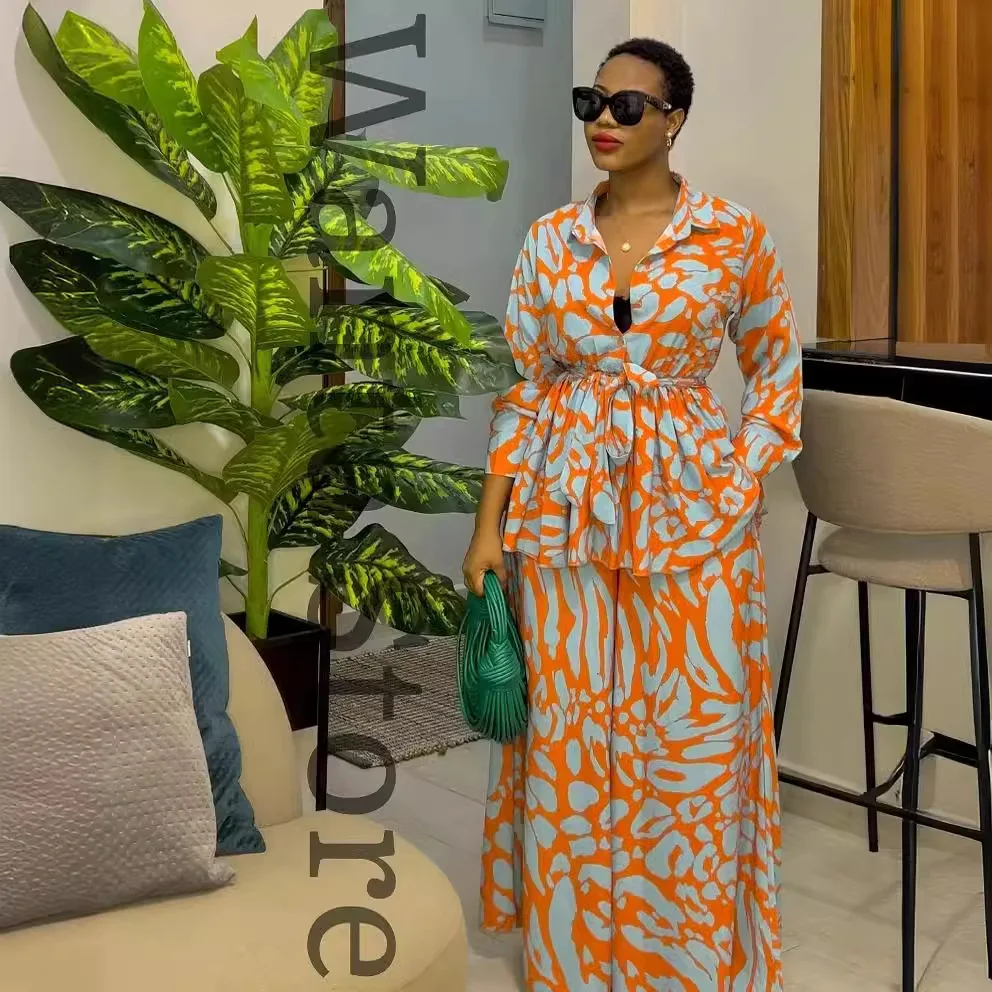 이슬람 인쇄 세트 여성 블라우스 탑 와이드 레그 팬츠 레이스 업 의상 2025 라마단 모로코 두바이 앙상블 아랍어 캐주얼 2 피스 슈트