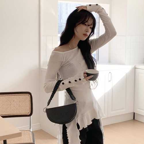 [다잇템]여자 프릴 코디 롱슬리브 언발 슬림핏 티셔츠