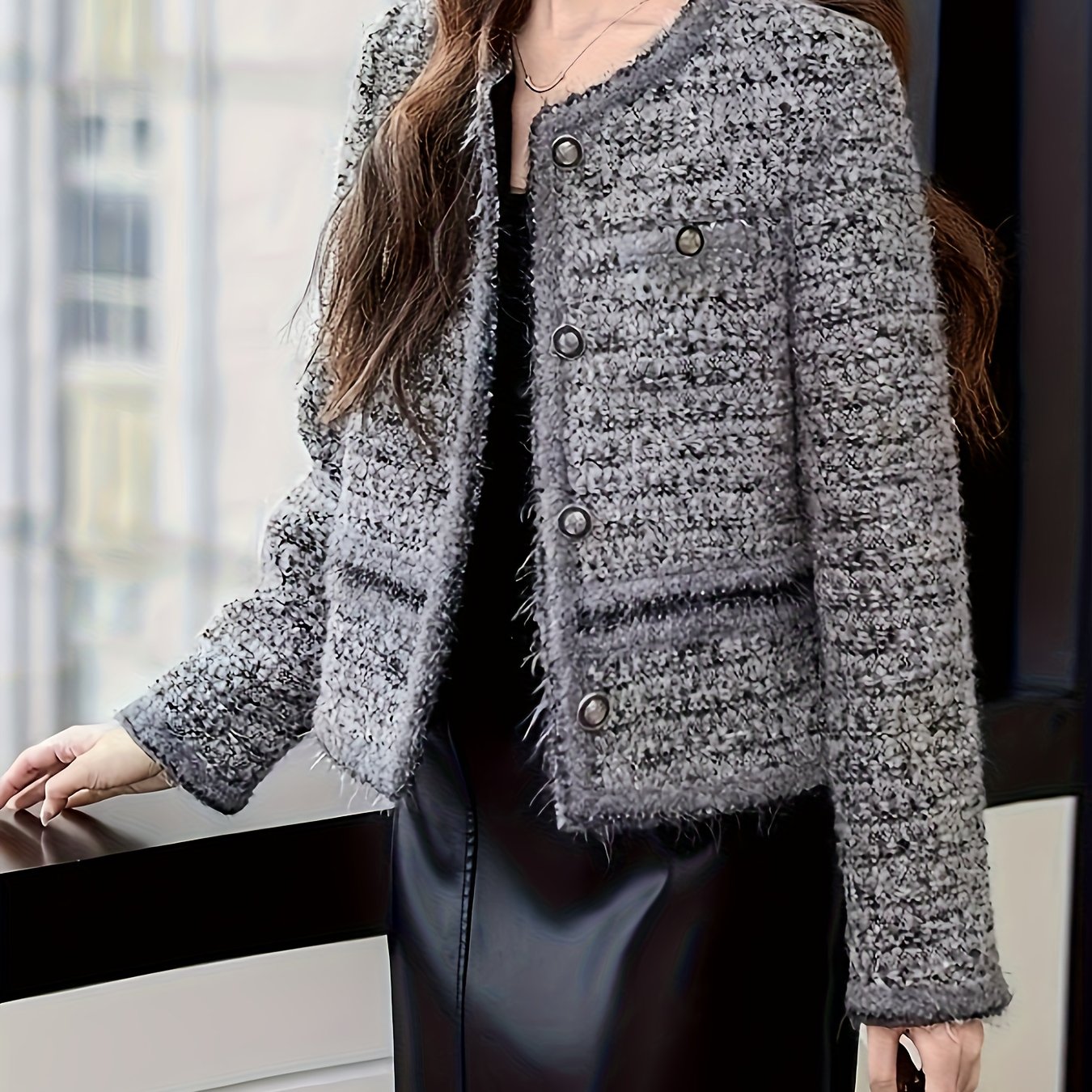 TEMU 여성용 시크한 블랙 트위드 캐주얼 자켓, 골든 버튼 및 화이트 트림 - 라운드 넥, 긴 소매, 버튼 업 프론트, 봄/가을에 완벽한 캐주얼 웨어 자켓 | 라운드 넥 자켓 | 버튼 클로저