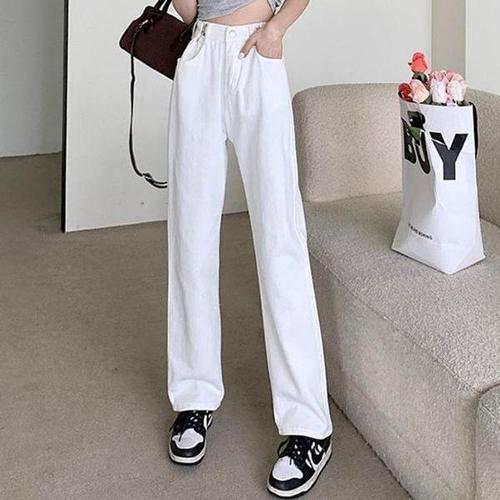 해피유통 여성 봄여름 루즈핏 흰색 청바지 심플 디자인 하이웨이스트 스트레이트 팬츠