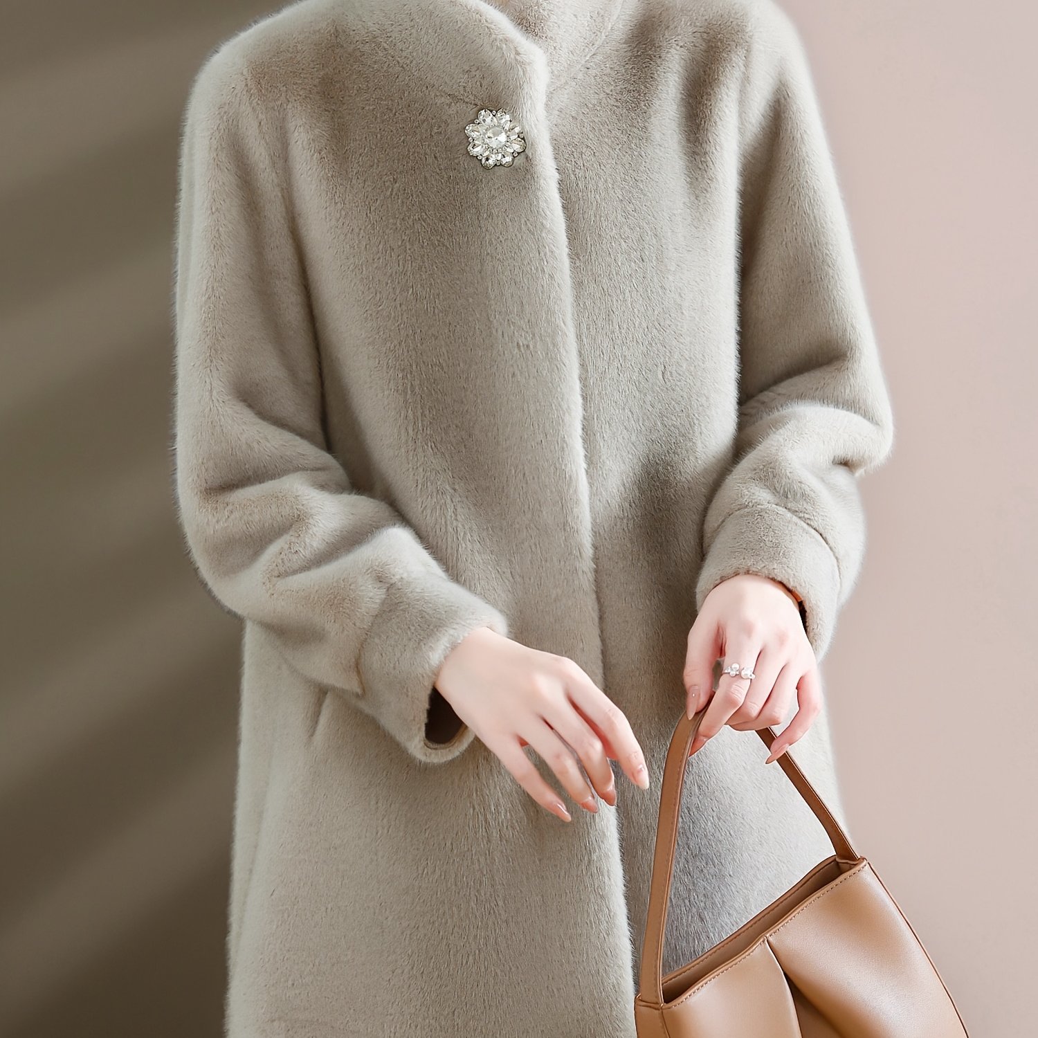 TEMU 신상 겨울 패션 우아한 라운드넥 단색 여성용 인조 모피 코트