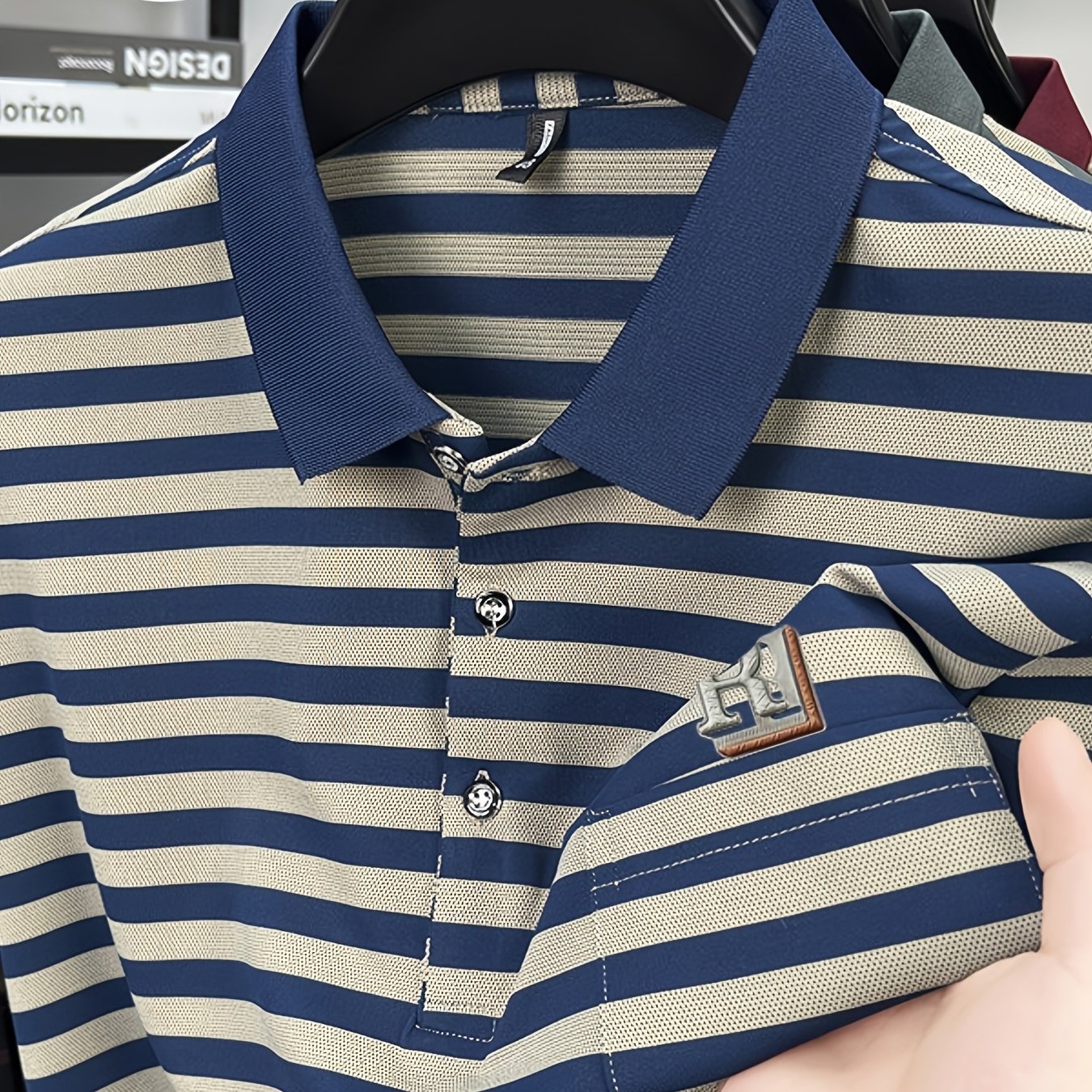 TEMU 남성용 신상 봄 니트 클래식 라펠 긴팔 페이크 투피스 폴로 셔츠, 트렌디하고 쉬운 기하학적 포니 프린트 디자인, 대비되는 색상의 넥라인 인터레이어 셔츠, 가볍고 통기성이 좋으며 부드럽고 피부 친화적인 원단