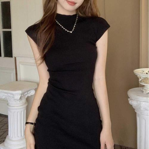 연말 모임 룩 블랙 미니 슬림 핏 여자 원피스 하이넥 WFL0IEM
