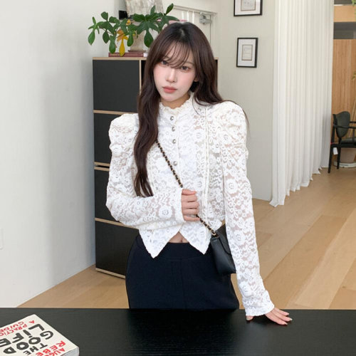 [옷자락]여자 연말 파티룩 프릴 레이스 긴팔 블라우스