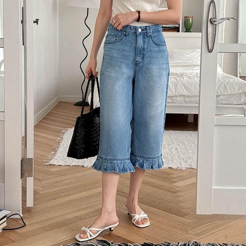 [옷자락]여자 8부 프릴 카프리데님 연청 빅사이즈 청바지