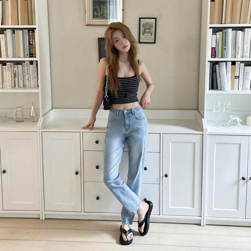 [다잇템]여자 하이웨스트 버튼 포인트 연청 스키니진