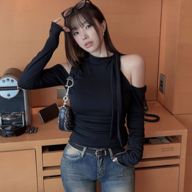 [미라클세븐]여성 오프숄더 프릴 니트 골지 티셔츠 옆트임 디자인