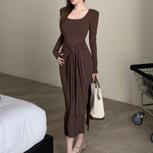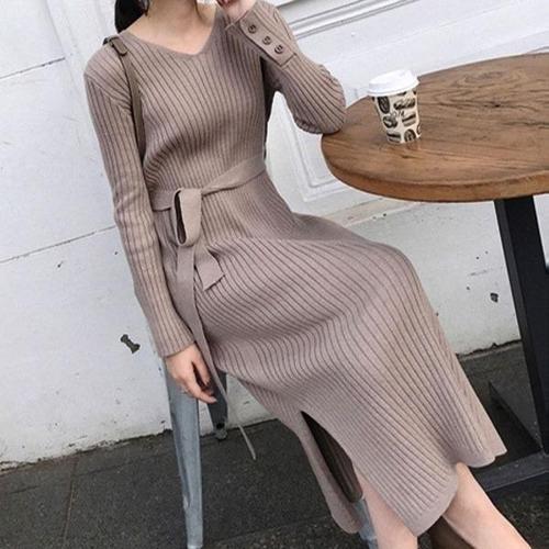chic 가을 겨울 옆트임 니트 스커트 니트 원피스 라운드넥 롱원피스 빅사이즈 여성용 간절기 패션코디
