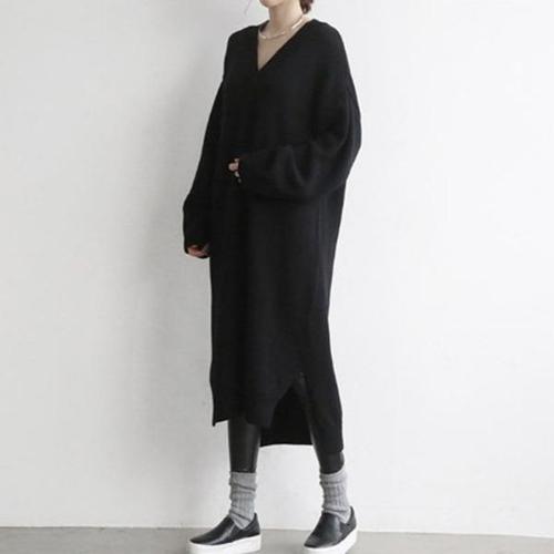 [엄지척]레이어드 루즈핏 겨울 여자 V넥 롱원피스 니트 옆트임_19951190_667501
