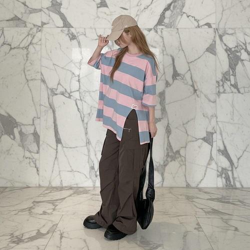 [미라클세븐]여성용 스트라이프 오버사이즈 라운드넥 반팔 티셔츠 옆트임