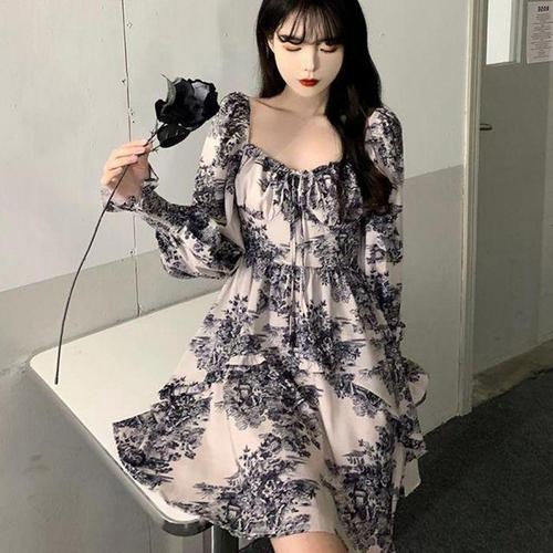 데일리룩 여성용 예쁜플리츠 스모크밴딩 플로럴 사각넥 롱드레스