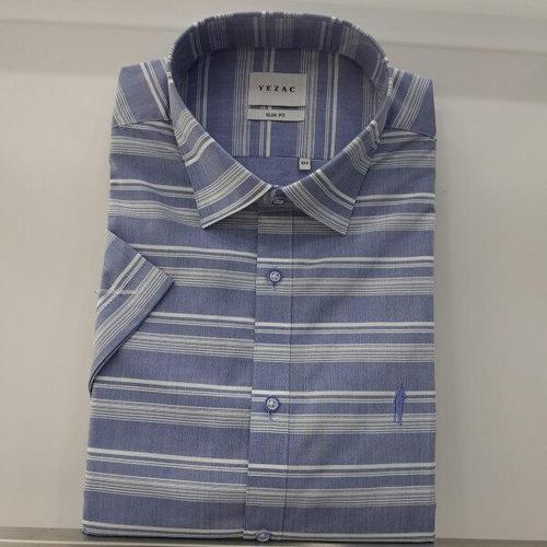 [예작]예작 20S/S 블루 멀티호리존탈 밑단일자 슬림 반팔셔츠 YJ0MBS479BL_SC