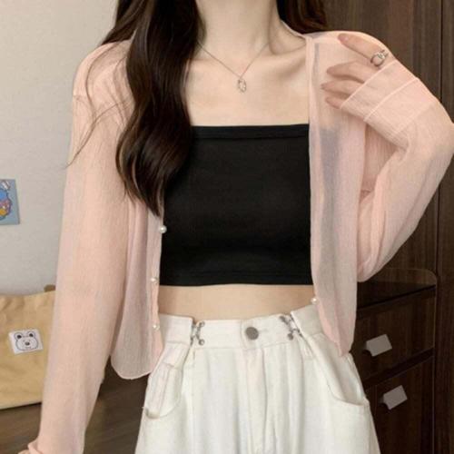 [셀러허브_여성트랜드패션]ONM 여성 시스루 플로잉 진주 오간자 볼레로 가디건