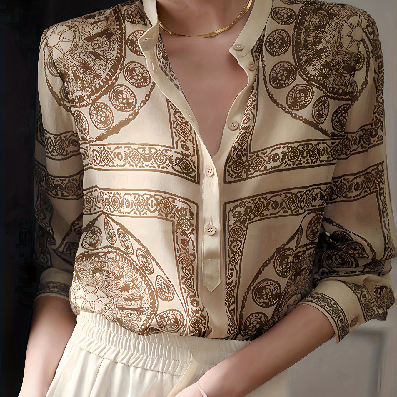 TEMU 우아한 빈티지 영감 기하학 꽃무늬 긴팔 블라우스, 갈색 & 골드 - 반투명 폴리에스터 셔츠, 봄 & 가을에 완벽, 다용도 의류 | 버튼 프론트 탑 | 폴리에스터 원단, 꽃무늬 블라우스