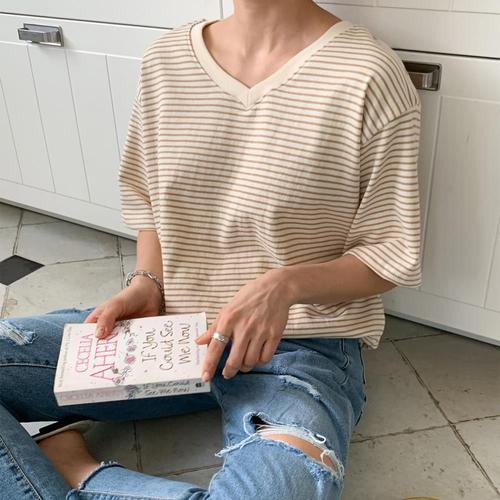 [체리캣] 여성용 여름 루즈핏 v넥 반팔 티셔츠 T-73