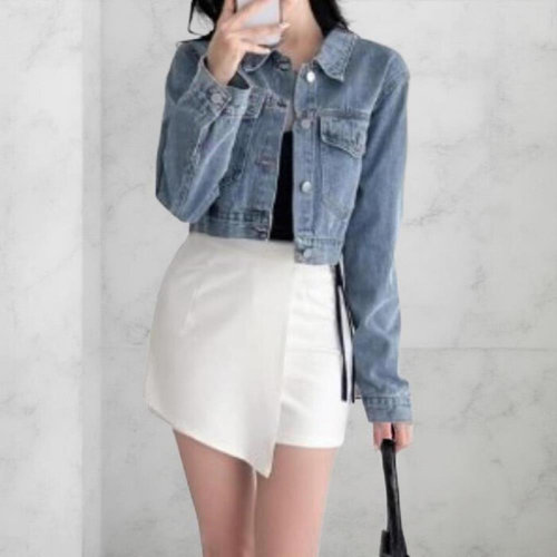 [옷자락] 여성 키치무드 워싱 코튼 루즈핏 세미크롭 데님 자켓