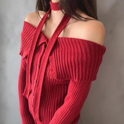 라라홀리 러블리 홀터넥 오프숄더 슬림 골지 니트티