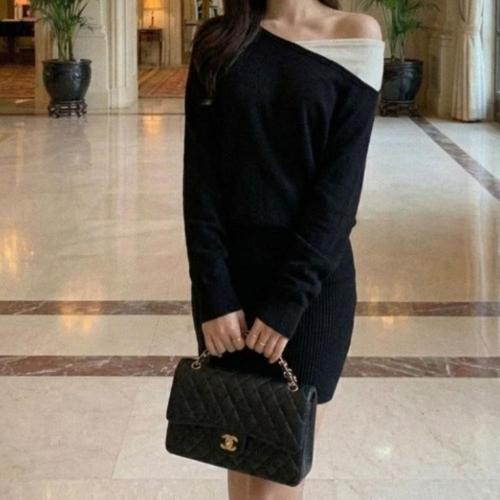 [시크블랙]챠링드 데미지 포인트 슬림 오프숄더 니트