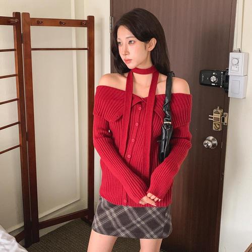 [옷자락]여성 사랑스러운 오프숄더 골지 초커넥 긴팔 니트