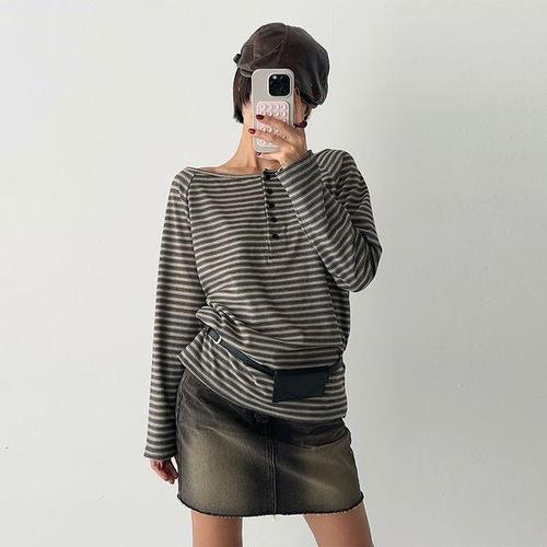 [유야]겉기모 단추 입술넥 단가라 오프숄더 긴팔티 쭉티 스트라이프 -TS0939H- 빅사이즈 루즈핏 여성 가..