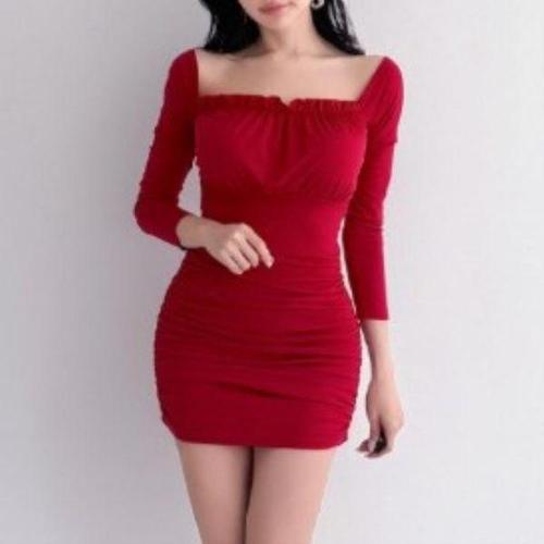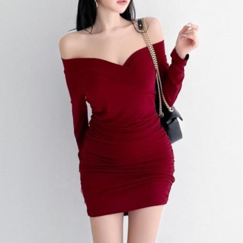 [옷자락]여성 파티룩 오프숄더 슬림핏 긴팔 셔링 미니 원피스