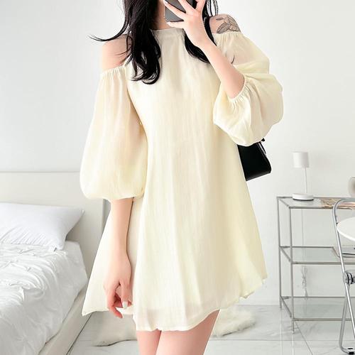 여성 퍼프 소매 오프숄더 연출 미니원피스