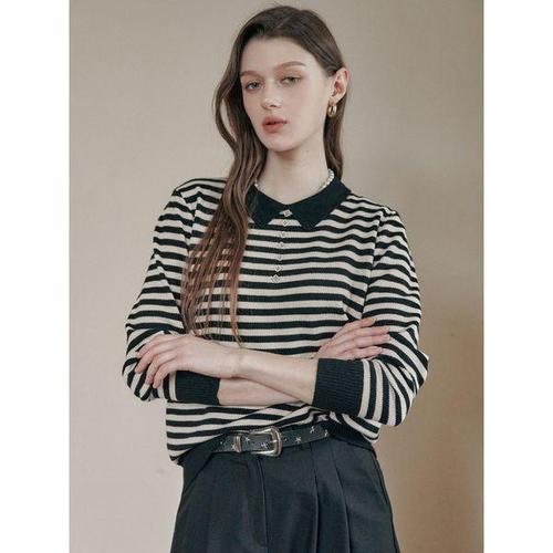 [마쟈]큐빅버튼 스트라이프 오픈카라 니트