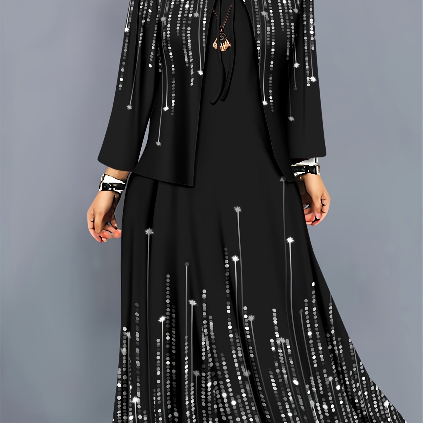 TEMU 세련된 여성용 투피스 세트. 블랙 앤 화이트 프린트 긴팔 가디건과 드레스가 함께 어우러져 일상적인 우아함을 연출합니다.