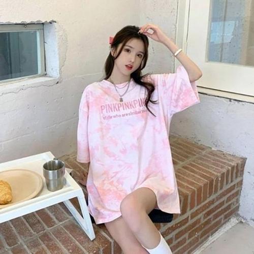예쁜 물감 나염 영문 자수 포인트 여성 반팔 티셔스