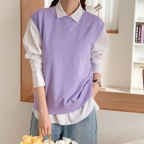 [브이와이][VY] 여자 보라색 민무늬 캠퍼스룩 면원단 와펜 라운드 조끼_16281095_588847